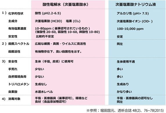 塩化ナトリウムと塩酸を電気分解して得られる酸性電解水(次亜塩素酸水)は、低い塩素濃度でも次亜塩素酸ナトリウムと同等またはそれ以上の高い除菌力を短時間で発揮します。